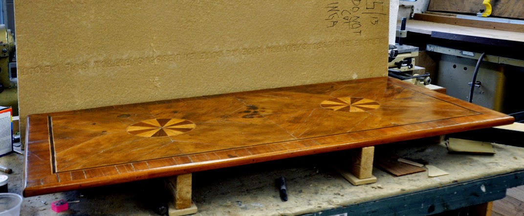 ok .. i've been working on this off and on for about 3 weeks, but i finally whipped it yesterday .. i was able to reglue all the original pieces with their original finish back flat onto the original top. i'll be installing it back on the bureau on friday morning. the owner came by yesterday to see it and she was totally thrilled ... i think i made hero status, for her at least. below are a series of photos